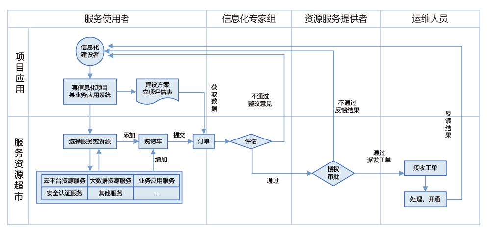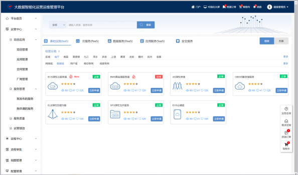 支持云、大数据、业务应用服务资源,整合形成统一运营服务资源超市。为客户提供简单、稳定、安全可扩展的线上服务资源共享申请与授权。